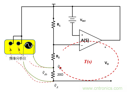您可使用LM4041-N顯示如何找到一個點來連接用于波特圖測量的頻率分析儀的參考引線。首先,開發(fā)交流小信號模型。然后,確定參考點,以便您可找到一個斷點,以滿足這兩個要求: