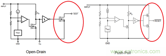 推挽和開漏指輸出類型。推挽在輸出端使用兩個晶體管,頂部晶體管導通,將輸出設置為高電平;底部晶體管導通,將輸出設置為低電平。開漏使用一個晶體管將輸出設置為低電平,并使用上拉電阻而非頂部晶體管將輸出設置為高電平。推挽的優(yōu)點是速度更快、功耗更低。但開漏輸出可連接在一起,以創(chuàng)建OR / AND邏輯輸出配置。圖3所示為開漏輸出和推挽輸出。