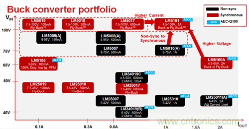 圖3所示為TI的寬VIN恒定導(dǎo)通時(shí)間(COT)降壓轉(zhuǎn)換器產(chǎn)品組合。這些轉(zhuǎn)換器不僅消除了鉗位電路,而且COT架構(gòu)進(jìn)一步簡(jiǎn)化了設(shè)計(jì),因?yàn)樗恍枰a(bǔ)償,可以保持高的降壓比,從而消除中間軌。非同步LM5007和LM5009在電子電表和電動(dòng)工具中很流行,而低電流同步器件如LM5017、LM5018和LM5019在伺服驅(qū)動(dòng)器空間中很受歡迎。