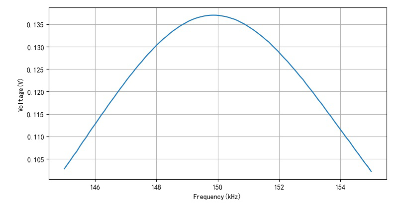 使用 數(shù)字變成信號(hào)源DG1062[8] 輸出 145kHz~155kHz 正弦波掃描諧振回路。調(diào)整中周磁帽,使得輸出電壓達(dá)到最高。