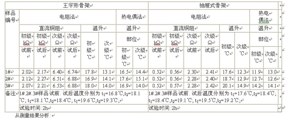 b.采用王字形骨架的變壓器用熱電偶法和電阻法測(cè)出的變壓器溫升非常接近。