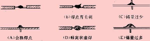 ?。ǎ粒┧緫?yīng)是錫點(diǎn)光亮,圓滑而無(wú)毛刺,錫量適中。錫和被焊物融合牢固。不應(yīng)有虛焊和假焊。