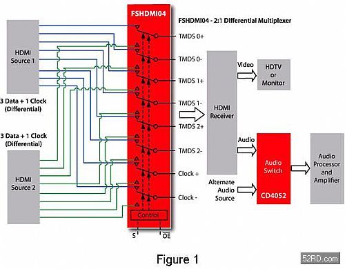 以FSHDMI04 這類HDMI開關(guān)為例,只需簡單地插入到選定的HDMI接收器和兩個HDMI連接器之間即可。若針對一個完整的解決方案,還需要切換較高電壓及較低頻率的控制信號,建議使用一個至少165MHz的簡單5V 方型 SPDT開關(guān),例如FSAL200 或 FSAV330。這些控制信號用于接收器(Sink) 和資料源(Source) 之間的首次交換,而資料源以此來決定接收器能夠處理什麼樣的視頻解析度,只需要FSHMDI04加上第二個用于控制資料的開關(guān),即可在單輸入設(shè)計(jì)上完全實(shí)現(xiàn)第二個HDMI輸入埠。