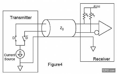 許多設(shè)計(jì)人員都很熟悉電壓驅(qū)動應(yīng)用,并因此很自然地設(shè)想導(dǎo)通阻抗是開關(guān)選擇中最重要的規(guī)格。這種設(shè)想出于在電壓源應(yīng)用中,導(dǎo)通阻抗往往會引起插損和信號衰減。但幸運(yùn)地,HDMI 和 DVI信號并沒有這個問題,因?yàn)樗鼈兪褂镁哂薪K端電阻的電流源來建立信號電平。圖4所示為如何建立TMDS信號的基本原理圖。
