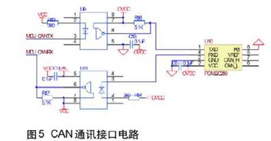 高速CAN總線的驅(qū)動(dòng)芯片采用飛利浦的82C250,采用光隔離器件,抵抗CAN總線對(duì)數(shù)字信號(hào)的電磁干擾,總線通訊電路如圖5。