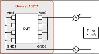 實際上,周圍溫度維持在150oC時,TDDB由隔離器的施加應(yīng)力電壓決定(請參見圖5)。測試之初便激活一個計時器,其在隔離器電流超出1mA時停止,表明電介質(zhì)擊穿。記錄每個測試電壓的故障時間,并根據(jù)理論E模型曲線進行繪圖。