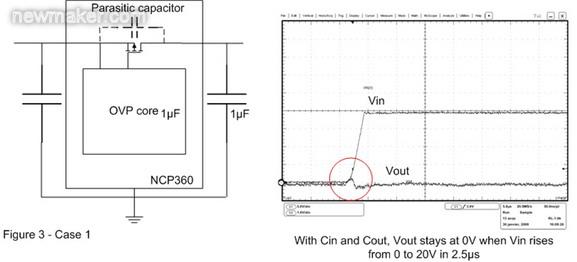 在圖3的案例2中,輸出電容已被移除。這樣,當(dāng)OVP器件輸入端出現(xiàn)快速輸入瞬態(tài)現(xiàn)象時,旁路元件將保持開路。這時可以在輸出端觀察到過沖,這個過沖可能會損壞連接至OVP輸出端的電子元器件。為了解決這個問題,必須在輸出引腳上連接一個輸出電容,并盡量靠近OVP 器件擺放。