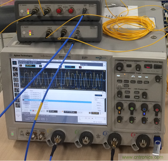 從被測(cè)系統(tǒng)引出的兩路光纖信號(hào)經(jīng)N1075A-S32或者81495A光電轉(zhuǎn)換器把兩路光信號(hào)轉(zhuǎn)成電信號(hào),然后用高帶寬的DSA90000X實(shí)時(shí)示波器進(jìn)行測(cè)量。