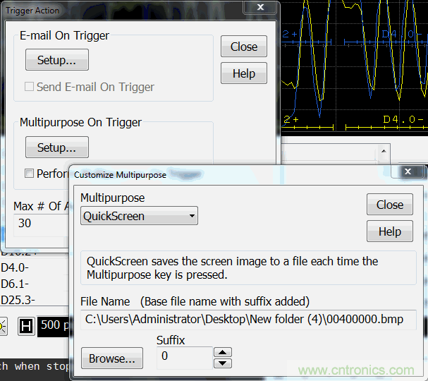 3)在示波器的Trigger Action里設(shè)置自動(dòng)保存測(cè)量結(jié)果,如圖10所示,可以設(shè)置自動(dòng)保存測(cè)量結(jié)果的次數(shù)。隨后用戶(hù)可以對(duì)測(cè)量結(jié)果進(jìn)行整理和統(tǒng)計(jì)分析。