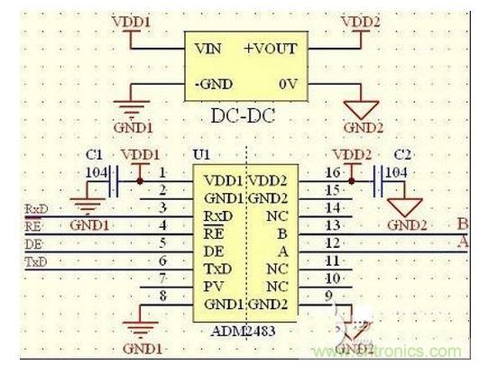 要實現(xiàn)隔離RS-485接口的電路設(shè)計只需在ADM2483的電源與地之間接一個104的去耦電容即可。當(dāng)然,DC-DC隔離電源是必不可少的。其電路連接如下圖: