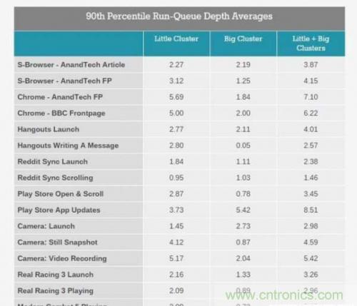 測試者對(duì)16個(gè)不同的場景進(jìn)行測試,并且每個(gè)場景的表現(xiàn)都通過圖表體現(xiàn)了出來。從圖片結(jié)論中我們可以看出,核心越多,設(shè)備表現(xiàn)就越好,尤其是在電源和負(fù)載的分配上。我們看到,四核處理器要比雙核更高效,而兩個(gè)單獨(dú)的核心群要比一個(gè)更大的核心表現(xiàn)更好。