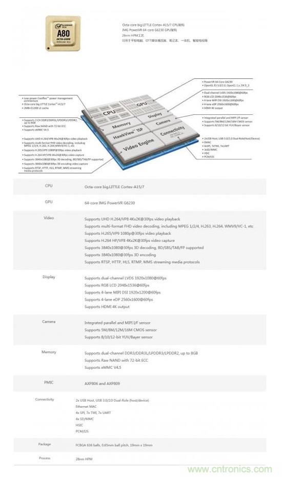 多媒體方面, H8支持多格式1080p@60fps視頻編解碼, 支持H.265/HEVC視頻處理,集成8M ISP圖像信號處理架構(gòu),可支持800萬像素攝像頭。 顯示方面,H8支持HDMI 1080p@60fps顯示,支持HDCP V1.2協(xié)議,支持HDMI CEC。此外,H8集成了全志新一代麗色顯示技術(shù),圖像顯示質(zhì)量進一步提升。事實上,H8芯片最早是應(yīng)用于電視盒子。