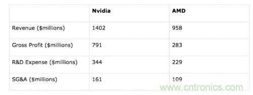 另一個重要的優(yōu)勢是,Nvidia公司的財務(wù)實力在恢復(fù)。目前Nvidia是盈利的,并有望在研發(fā)中比AMD投入更多的的資金,而此前則不得不削減營運費用。下面的表格提供了兩家公司最新一個季度的財務(wù)狀況比較: