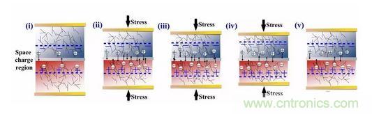 這類有機(jī)離子p-n節(jié)的兩個電極分別由帶有相反電荷的聚電解質(zhì)納米復(fù)合材料構(gòu)成,中間通過聚碳酸酯薄膜隔開。當(dāng)向p-n節(jié)上施加機(jī)械應(yīng)力時,內(nèi)部載流子(可移動離子)的平衡被打破,p-n節(jié)的固有機(jī)制驅(qū)使載流子開始持續(xù)擴(kuò)散,直至新的平衡重新建立。這一過程完成了機(jī)械能到電能的轉(zhuǎn)換。由于離子運(yùn)動的特點(diǎn),整個過程恰好匹配人類日常肢體運(yùn)動的頻率。