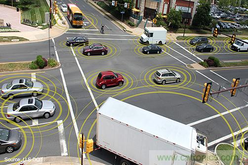 圖 1: 無人駕駛車輛彼此的通信以及與路邊基礎(chǔ)設(shè)施的通信是未來幾年推廣該項技術(shù)的一項關(guān)鍵元素。(來源: 美國交通部)