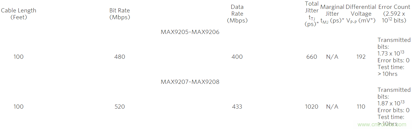 表2、表3分別為MAX9205–MAX9206和MAX9207–MAX9208串行-解串器在5英尺至60英尺電纜長度下的測試結(jié)果。比特率為串行信號速率,數(shù)據(jù)速率為“有效載荷”串行數(shù)據(jù)速率(數(shù)據(jù)速率 = (10/12) × 比特率)。