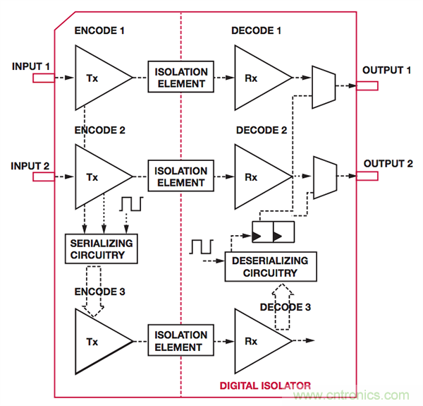 該延遲可確保跨越隔離柵的編碼信號之間具有最小隔離,從而允許接收器明確解碼一切編碼傳輸序列。缺點是隨著速度的增加,這種延遲會大幅增加隔離器的傳播延遲,進(jìn)而限制滿足SPI時序要求的能力。