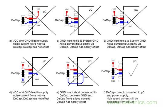 【導讀】一顆小小的退耦電容,引發(fā)的糾結,首先來說說退耦電容的布局布線,下圖中a-e都不對?是由哪些因素引起的呢?