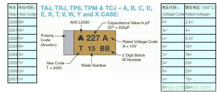 ① 表示系列,AVX 有TAJ 和TPS 兩個系列,TAJ 表示普通鉭電容,TPS 表示的是