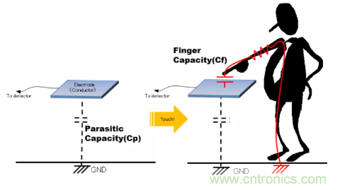 靜電電容發(fā)生的機理如圖2所示。電極和其周圍的導電體(地線、金屬框等)之間存在寄生電容(Parasitic Capacity: Cp)。當人體接近、觸摸電極時,人體和電極之間通過手指產(chǎn)生新增的靜電電容(Finger Capacity: Cf),并通過可以導電的人體和大地連接(如圖2中紅線所示)。