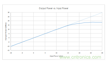 這種失配會導致來自輸入信號的能量被反射至對應的信號源。反射信號與入射信號配合,在PIN二極管產(chǎn)生一個電壓最小的駐波,因為反射信號在傳輸線上暫時呈現(xiàn)最低阻抗。傳輸線上的每個最小電壓都有一個對應的最大電流。最大電流流經(jīng)PIN二極管,導致二極管I層中的自由電荷載流子量增加,從而產(chǎn)生更低串聯(lián)電阻、更大阻抗失配以及“更小”的最小電壓。最后,二極管的電阻將達到最小值——該值取決于PIN二極管的設計和RF信號的幅值。RF信號幅值增大時,迫使二極管達到充分導通狀態(tài),從而進一步降低二極管的電阻,直到二極管飽和并產(chǎn)生盡可能的最小電阻。由此得到輸出功率與輸入功率的對比曲線,如下所示。