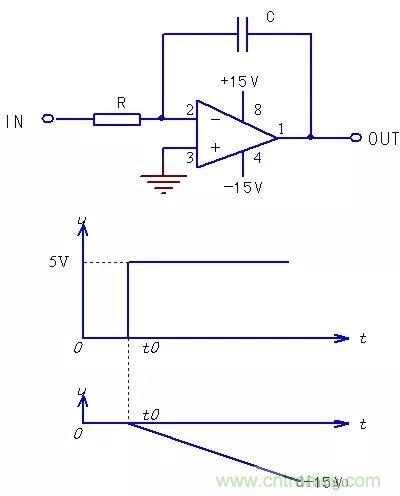 2、反相放大器。在輸入信號的t0時刻之后平頂期間,電容處于較為平緩的充電過程,其等效RP經(jīng)歷小于R、等于R和大于R的三個階段,因而在放大過程中,在放大特性的作用下,其實又經(jīng)歷了反相衰減、反相、反相放大等三個小過程。而無論是衰減、反相還是反相放大,都說明在此階段,積分電路其實是扮演著線性放大器的角色。