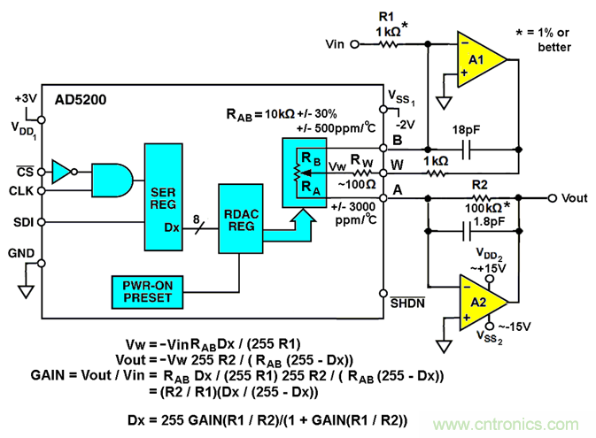 同時(shí),在A1反饋和A2輸入(圖1)上使用RAB電阻元件將RAB容差和溫度系數(shù)(溫度系數(shù))的靈敏度進(jìn)行比率(AD5200中+/- 30%和500ppm / oC),留下R1和R2作為增益集準(zhǔn)確性的唯一主導(dǎo)因素。