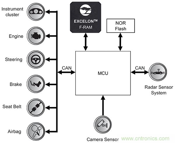 圖 4:汽車 ADAS 開發(fā)人員可以在基于微控制器 (MCU) 的設(shè)計(jì)中,將 Excelon F-RAM 器件(用于存儲關(guān)鍵數(shù)據(jù))與 NOR 閃存器件(常用于存儲固件或配置數(shù)據(jù))結(jié)合起來使用。(圖片:Cypress Semiconductor)