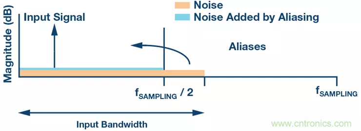 對(duì)轉(zhuǎn)換器來說,輸入信號(hào)帶寬是一個(gè)問題。在采樣理論中,我們知道高于奈奎斯特頻率(ADC采樣頻率的一半)的頻率信號(hào)應(yīng)被移除,否則這些頻率信號(hào)將在目標(biāo)頻帶中產(chǎn)生鏡像或混疊。通常,噪聲頻譜中有相當(dāng)一部分功率存在于ADC奈奎斯特頻率以上的頻帶中。如果不處理這種噪聲,它將混疊到奈奎斯特頻率以下,增加本底噪聲(如圖2所示),使系統(tǒng)的動(dòng)態(tài)范圍明顯降低。