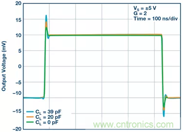 為了更好地闡述上面的觀點(diǎn),圖5顯示了放大器驅(qū)動(dòng)不同阻性負(fù)載的性能差異。圖6顯示了容性負(fù)載引起的小信號(hào)過沖,這會(huì)影響建立時(shí)間和線性度。