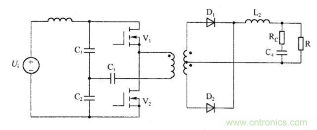 電路的結(jié)構(gòu)類似于全橋式,只是把其中的兩只開關(guān)管(T3、T4)換成了兩只等值大電容 C1、C2。