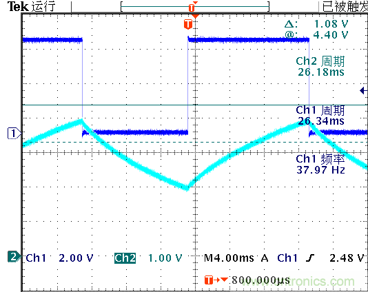實際測量555定時器工作電壓波形如下。實際周期為:T=26.34ms。