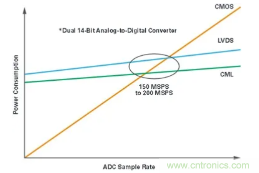 在大約150 MSP至200 MSPS和14位分辨率時(shí),就功耗而言,CML輸出驅(qū)動(dòng)器的效率開始占優(yōu)。CML的優(yōu)點(diǎn)是:因?yàn)閿?shù)據(jù)的串行化,所以對(duì)于給定的分辨率,它需要的輸出對(duì)數(shù)少于LVDS和CMOS驅(qū)動(dòng)器。JESD204B接口規(guī)范所說明的CML驅(qū)動(dòng)器還有一個(gè)額外的優(yōu)勢(shì),因?yàn)楫?dāng)采樣速率提高并提升輸出線路速率時(shí),該規(guī)范要求降低峰峰值電壓水平。