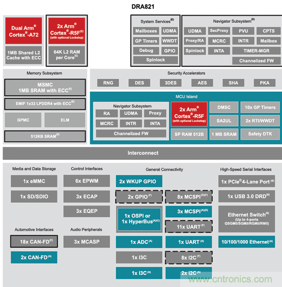 DRA821在一個(gè)集成的安全子系統(tǒng)中集成了最新的安全功能。此外,該器件通過(guò)了第三方評(píng)估機(jī)構(gòu)的功能安全認(rèn)證,達(dá)到了最高的ASIL標(biāo)準(zhǔn)(汽車(chē)安全完整性等級(jí))ASIL-D。DRA821包括各種高速I(mǎi)/O,如四口千兆TSN以太網(wǎng)交換機(jī)、PCIe和USB 3.0,以及傳統(tǒng)的汽車(chē)外設(shè),如CAN-FD和UART/LIN。