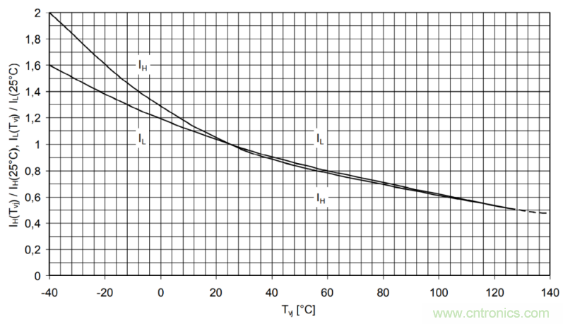 IH是使晶閘管維持通態(tài)所必需的最小通態(tài)電流值。IH隨著結(jié)溫的升高而減?。ㄒ?jiàn)圖9)。