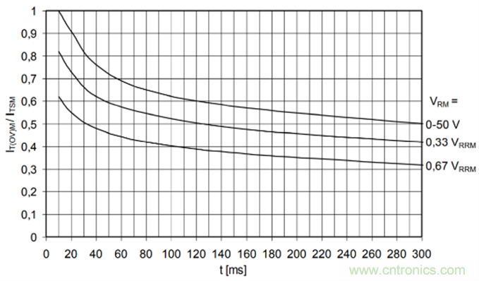 圖6. 數(shù)個(gè)50Hz正弦半波的最大通態(tài)過(guò)載電流 IT(OV)M、IF(OV)M(與10ms和Tvj max對(duì)應(yīng)的浪涌電流ITSM或IFSM有關(guān))與時(shí)間t之間的典型關(guān)系曲線。參數(shù):反向阻斷電壓VRM