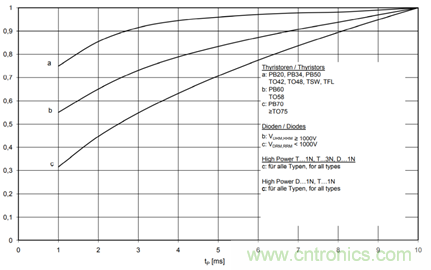對(duì)于周期短于10ms的正弦半波,最大額定∫i²dt值如圖13所示。電壓應(yīng)力和重復(fù)性同樣適用于通態(tài)浪涌電流。超過(guò)最大允許值時(shí),器件可能損壞。此外,尤其是對(duì)大直徑晶閘管而言,不得超過(guò)允許的臨界開(kāi)通電流變化率(di/dt)cr。