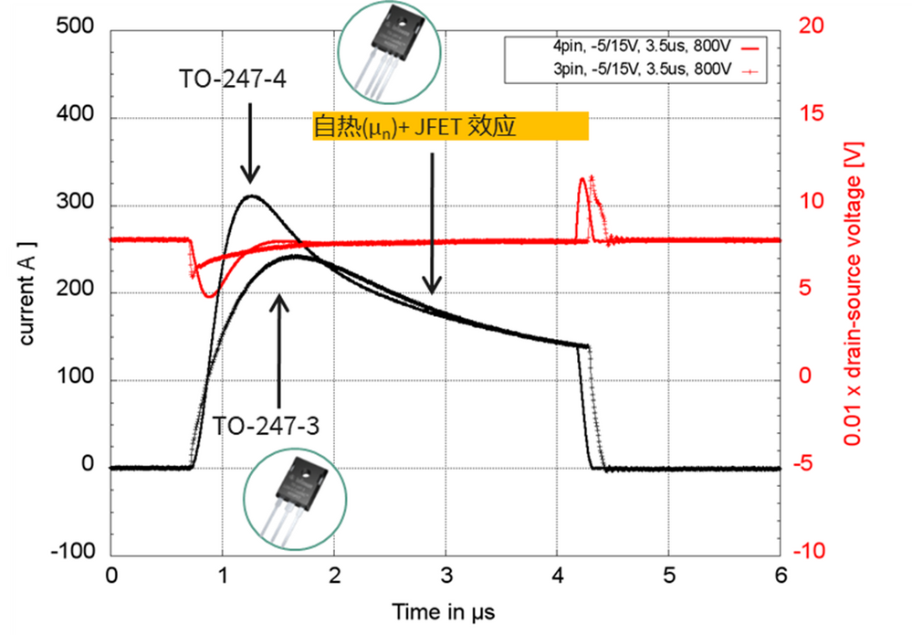 我們以下圖為例,來說明SiC MOSFET的一類短路過程。這是兩個45mΩ 1200V CoolSiC?MOSFET的短路波形:一個是4腳的TO-247封裝,另一個是3腳TO-247封裝。圖中顯示了兩者在VDS=800V的直流電壓下的情況。