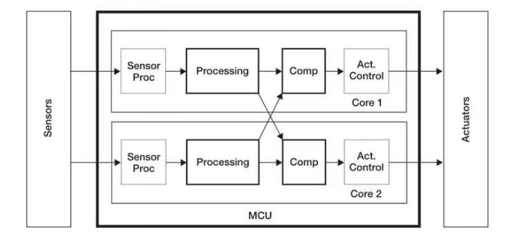 目前市場(chǎng)上主要的功能安全解決方案有兩種:應(yīng)用最廣泛的一種被稱(chēng)為“鎖步(lockstep)”解決方案,這是一種比較簡(jiǎn)單粗暴的方法,在汽車(chē)CPU中被廣泛使用。該方法就是用兩個(gè)處理器內(nèi)核等同樣的邏輯來(lái)執(zhí)行一個(gè)程序以實(shí)現(xiàn)同樣的一個(gè)功能,由它們同時(shí)執(zhí)行并在執(zhí)行完之后來(lái)比較這個(gè)結(jié)果,看看這兩個(gè)結(jié)果是否一致。在受到高溫或者高濕影響時(shí),如果這兩個(gè)內(nèi)核得到的兩個(gè)結(jié)果是一致的話(huà),那證明這兩塊邏輯是運(yùn)行正確的,有關(guān)計(jì)算和控制還能正確地執(zhí)行。