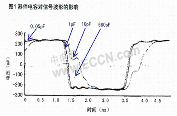 傳輸速率為12Mbps時(shí),其保持電平的時(shí)間要長(zhǎng)得多(80ns)。在此數(shù)據(jù)傳輸率條件下,10pF或更小的電容值將使得數(shù)據(jù)通過(guò)時(shí)的失真最小。當(dāng)傳輸速率提高到480Mbps時(shí),信號(hào)具有短得多的電平保持時(shí)間(2.0ns)。此時(shí)10pF電容的ESD抑制器件已經(jīng)引起波形失真:它減少了電平保持時(shí)間并使前沿和后沿的形狀大為改變。而660 pF電容的ESD抑制器件則造成了相當(dāng)大的失真,以致于波形甚至無(wú)法達(dá)到信號(hào)工作電壓。圖1顯示了不同ESD抑制器件對(duì)480Mbps數(shù)據(jù)波形的影響。