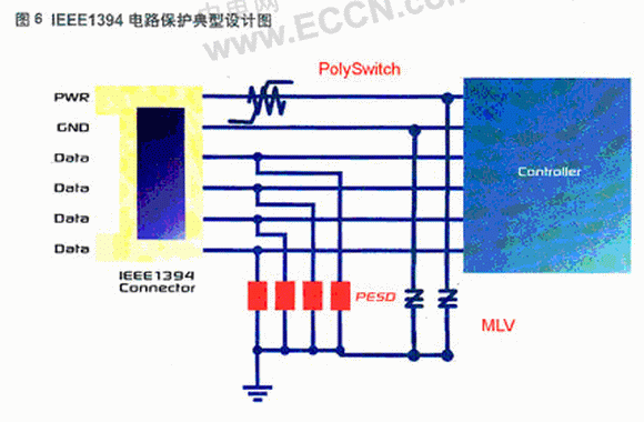 圖4、圖5和圖6展示了利用瑞侃電路保護(hù)部門(mén)PESD器件對(duì)HDMI1.3、USB2.0和IEEE1394接口電路進(jìn)行保護(hù)的典型應(yīng)用。這些保護(hù)將ESD與敏感電路隔離。在傳輸線(xiàn)路脈沖(TLP) 測(cè)試和IEC61000-4-2測(cè)試中,尤其是經(jīng)過(guò)多次采樣(1000次TLP測(cè)試)后,其性能要比其他可比較的元件好。相對(duì)于其他典型的聚合物ESD防護(hù)器件,這類(lèi)PESD器件的較低觸發(fā)電壓(通常150V)和低箝位電壓(通常25V)能更好的幫助保護(hù)敏感電子元件。該器件采用電子工業(yè)中最流行的0603和0402貼裝形式,符合RoHS的嚴(yán)格要求;幫助機(jī)頂盒敏感電路、手提電腦、手機(jī)和其它便攜式設(shè)備免ESD侵害。