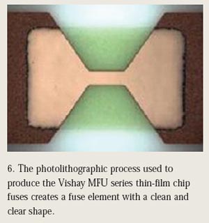 采用光刻技術(shù),可以與控制濺射薄膜層厚度相同的準(zhǔn)確度和精度對熔斷元件的長度和寬度施加控制。圖6顯示了如何采用光刻工藝制造Vishay的MFU系列薄膜芯片保險絲,制成的熔斷元件具有整潔和清晰的形狀。
