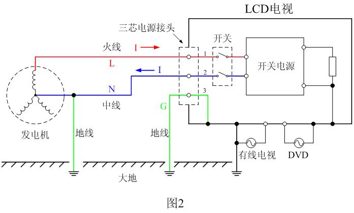 但電流I1沒有按圖2中的正常路線直接經(jīng)中線返回發(fā)電機(jī),而是經(jīng)地線(1)流入大地,然后電流I1在大地中被分成兩路I2和I5 ,I5直接通過大地(5)返回發(fā)電機(jī);而I2則通過大地與電視機(jī)的其它地線(2)(比如有線電視信號(hào)線或與電視機(jī)連接的其它設(shè)備連線)流回到電視機(jī)的外殼一端,I2電流經(jīng)過有線電視信號(hào)線接口(僅舉其中之一)后變?yōu)殡娏鱅3;I3再經(jīng)電視機(jī)內(nèi)的地線(3)以及電視機(jī)的三芯插頭3號(hào)線接頭,從三芯插頭3號(hào)線接頭流出,流出電流變成I4,電流I4再經(jīng)中線(4)流回發(fā)電機(jī)。
