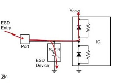 如圖5所示,IC上的軌對軌二極管負(fù)責(zé)將剩余的或“允通”電流導(dǎo)入VCC(它一般會通過旁路電容器回到GND)。很難確定什么樣的等效電阻適于為IC實(shí)現(xiàn)ESD保護(hù),但是無疑比板上ESD器件高得多。