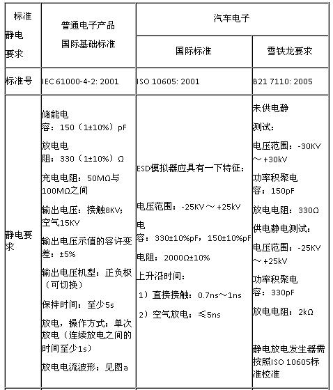 靜電問題對電子設(shè)備來說是必須考慮和預(yù)防的。為了防止電子設(shè)備在靜電干擾時出現(xiàn)產(chǎn)生不必要的誤動作,因此各個國家、各行業(yè)也都對于相關(guān)的電子設(shè)備做出了靜電測試(ESD)要求。本文就以普通電子產(chǎn)品的國際基礎(chǔ)標(biāo)準(zhǔn)要求與汽車電子的國際標(biāo)準(zhǔn)(以雪鐵龍企業(yè)標(biāo)準(zhǔn)為例)做一比較。