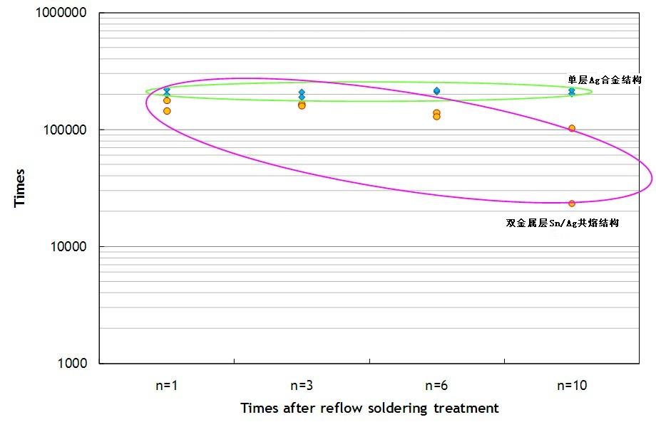 單層Ag合金結(jié)構(gòu)的保險(xiǎn)絲即使經(jīng)過多次高溫?zé)崽幚恚钥梢跃S持一定的耐脈沖能力,承受脈沖次數(shù)都可達(dá)十萬次以上。但是雙層Sn/Ag共熔結(jié)構(gòu)的保險(xiǎn)絲,其承受脈沖能力有明顯下降的趨勢,在經(jīng)過10次回流焊錫爐熱處理后,承受脈沖次數(shù)就會(huì)下降到十萬次以下。