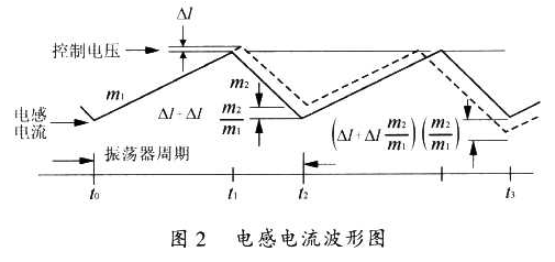 在圖l所示的電路中,當(dāng)電源的占空比大于50%,或變壓器工作在連續(xù)電流條件下時,整個電路就會產(chǎn)生分諧波振蕩,引起電源輸出的不穩(wěn)定。圖2表示了變壓器中電感電流的變化過程。沒在t0時刻,開關(guān)開始導(dǎo)通,使電感電流以斜率m1上升,該斜率是輸入電壓除以電感的函數(shù)。t1時刻,電流取樣輸入達(dá)到由控制電壓建立的門限,這導(dǎo)致開關(guān)斷開,電流以斜率m2衰減,直至下一個振蕩周期。如果此時有一個擾動加到控制電壓上,那么它將產(chǎn)生一個△I,這樣我們就會發(fā)現(xiàn)電路存在著不穩(wěn)定的情況,即在一個固定的振蕩器周期內(nèi),電流衰減時閘減少,最小電流開關(guān)接通時刻t2上升了△I+△Im2/m1,最小電流在下一個周期t3減小到(△I+△Im2/m4)(m2/m1),在每一個后續(xù)周期,該擾動m2/m1被相乘,在開關(guān)接通時交替增加和減小電感電流,也許需要幾個振蕩器周期才能使電感電流為零,使過程重新開始,如果m2/m1大于l,將會不穩(wěn)定。因此,圖l所示的電路在某狀態(tài)下存在著一定的失穩(wěn)隱患?! ?/p>