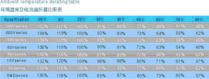 - 步驟3:如果設(shè)備的內(nèi)部環(huán)璋溫度大于25℃時(shí),PPTC元件會(huì)隨著溫度的增加,對(duì)于通過的電流有折減產(chǎn)生,為維持負(fù)載電流正常的提供,依據(jù)所對(duì)照的折減率我們可計(jì)算應(yīng)選用的 PPTC 元件IH值如下:IH=平均工作電流(I)/折減比率