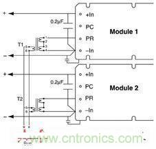 若數(shù)組內(nèi)模塊距離很遠(yuǎn),或利用獨(dú)立電源工作,可以采用變壓器耦合變頻模塊來(lái)實(shí)現(xiàn)均流,見(jiàn)圖3.由于均流的信號(hào)是高頻率的脈沖信號(hào),所以可用變壓器耦合。變壓器耦合的脈沖信號(hào)可以提供較強(qiáng)的共模噪聲免擾性,同時(shí)與主電源隔離,保持電壓在安全的低水平。這在需要機(jī)板對(duì)機(jī)板均分負(fù)載及備份的應(yīng)用中特別有效。由于PR脈沖頻寬很窄,一個(gè)細(xì)小、低電容值的變壓器就足夠了。