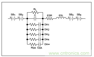 可對(duì)介質(zhì)吸收(DA)或Bob Pease所稱的“滲透”進(jìn)行建模,等效為無(wú)數(shù)個(gè)RC時(shí)間常數(shù):DA1至DAINFINITY,其中每個(gè)時(shí)間常數(shù)由電阻RDA和電容CDA組成。Bob Pease列舉了一些“滲透”非常重要的實(shí)例,本文附錄中介紹了一段關(guān)于吸收的有趣經(jīng)歷。